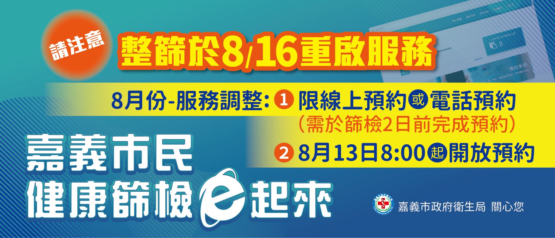 黃敏惠市長表示,幸福城市有大家一起努力,而您的健康是大家的幸福。整合性健康篩檢重視大家的健康,透過早期預防,照顧好每一個人的健康。因疫情的關係,整篩自5月16日起暫停服務。而8月16日將重啟服務,8月底前服務調整為限篩檢前2日完成「線上預約」或「電話預約」方式,嘉義市民健康篩檢資訊系統於8月13日上午8:00起開放線上預約(https://imsr.cichb.gov.tw/) ,6家整篩服務醫院同步開放電話預約,市民完成預約後請依約定時間持身分證、健保卡前往醫院,全程佩戴口罩接受服務。