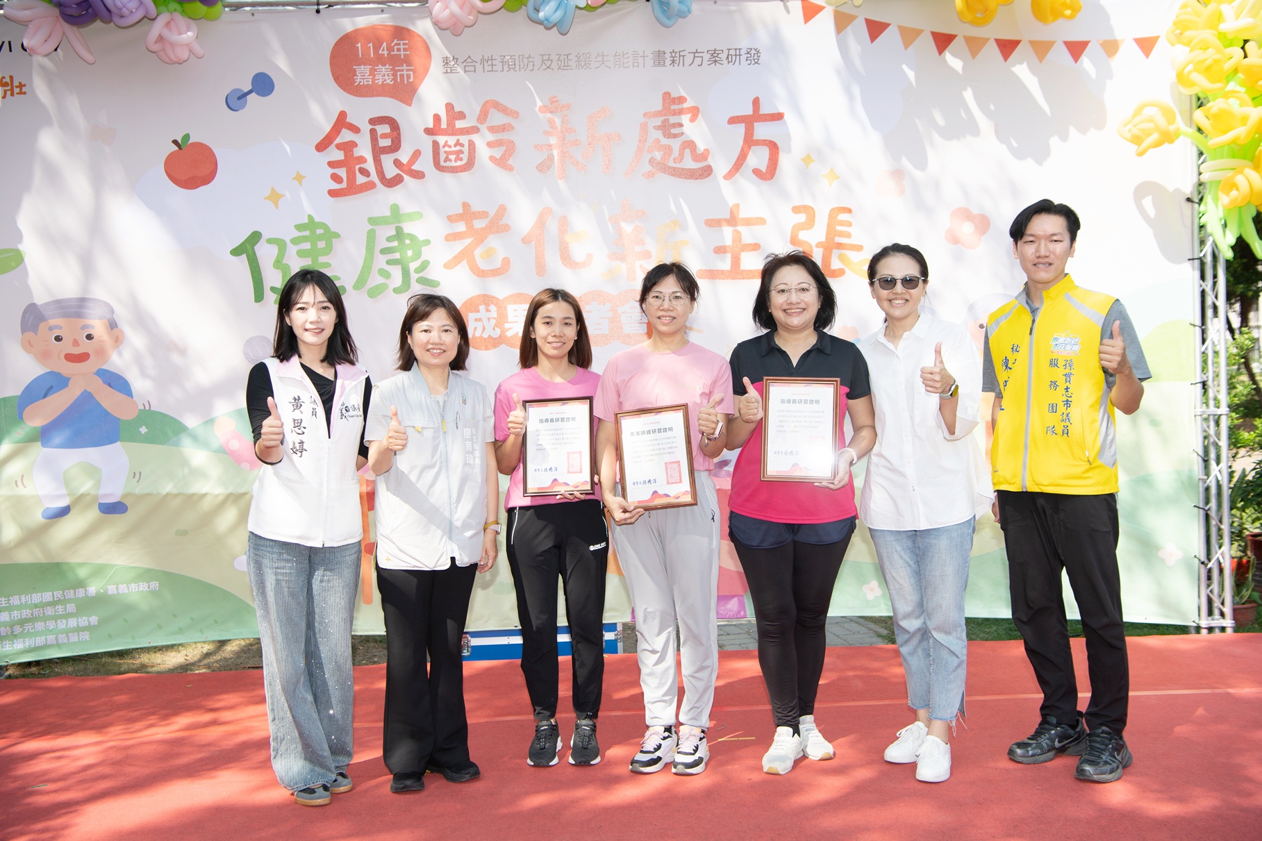 為促進健康老化與優質生活,嘉義市積極導入以行為改變為導向的健康促進計畫,鼓勵長者實踐健康行動、活出快樂人生。嘉義市政府衛生局114年委託全齡多元樂學發展協會並攜手衛生福利部嘉義醫院共同研發「114年健康老化人生社會處方箋模組方案」,於今(31)日在樂齡訓練場正式舉行結訓活動。嘉義市政府衛生局廖育瑋局長、衛生福利部嘉義醫院莊仁賓院長及全齡多元樂學發展協會陳秀萍理事長共同見證健康老化課程的成果。
