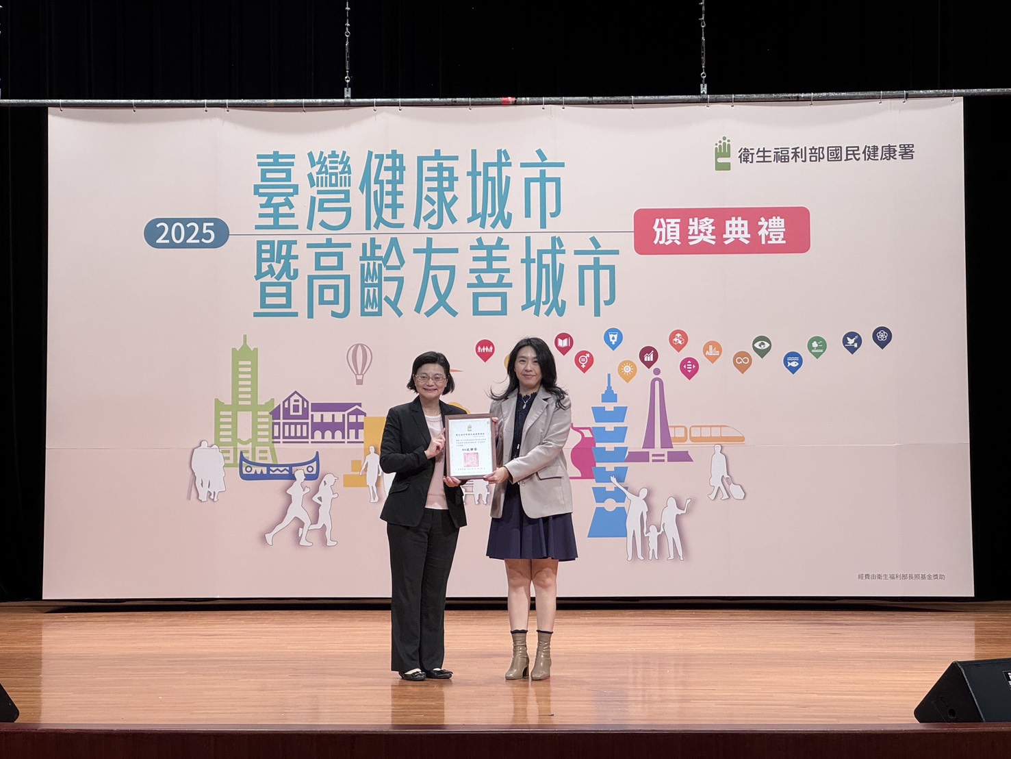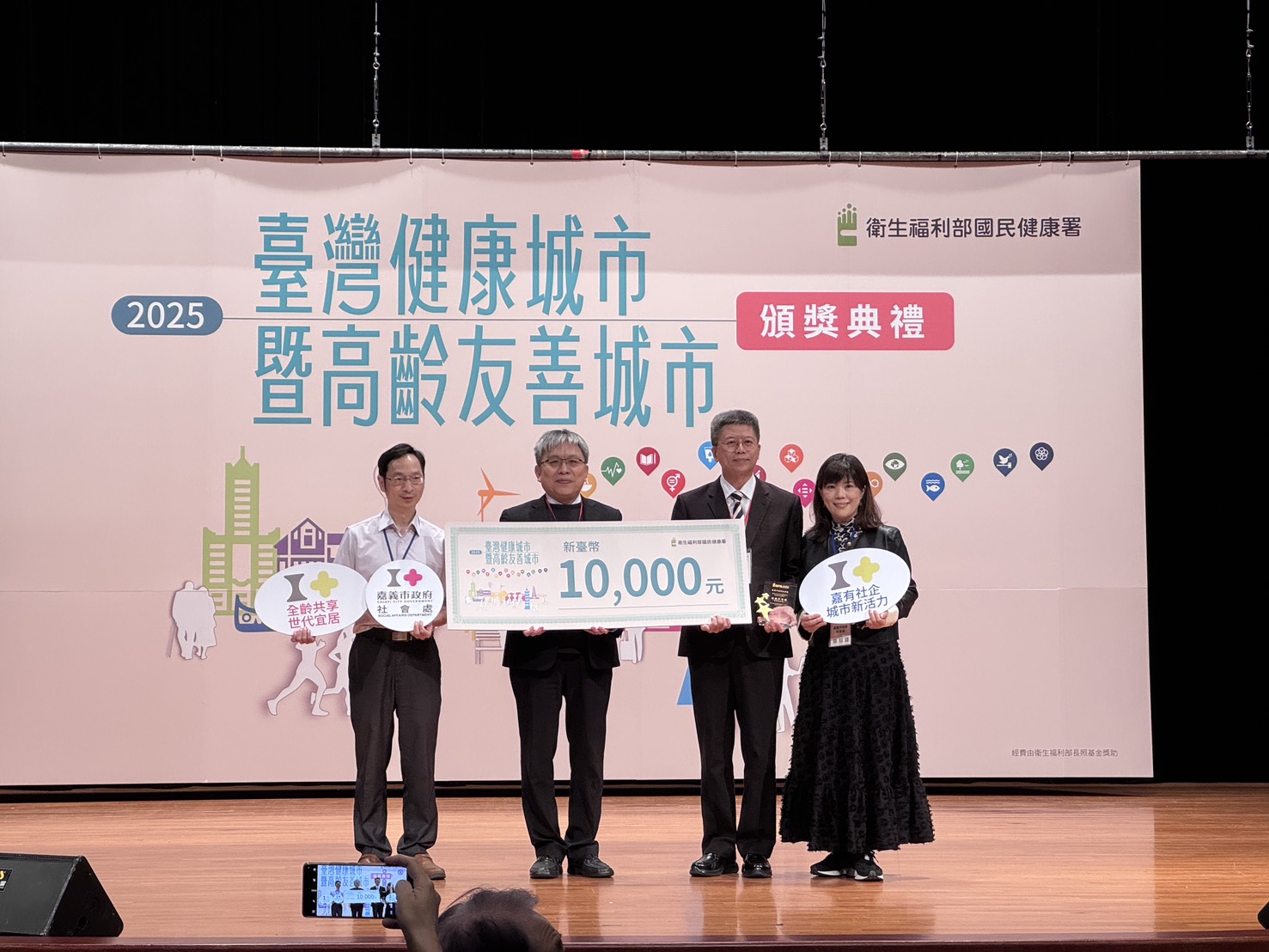今(28)日衛生福利部國民健康署於公務人力發展學院福華國際文教會館舉辦「114年臺灣健康暨高齡友善城市獎」頒獎典禮,嘉義市共榮獲4獎項,分別勇奪健康城市健康平等獎、韌性與創新獎佳作及海報獎,適逢議會期間,由林建宏參議代表市長黃敏惠率隊北上出席典禮受獎。