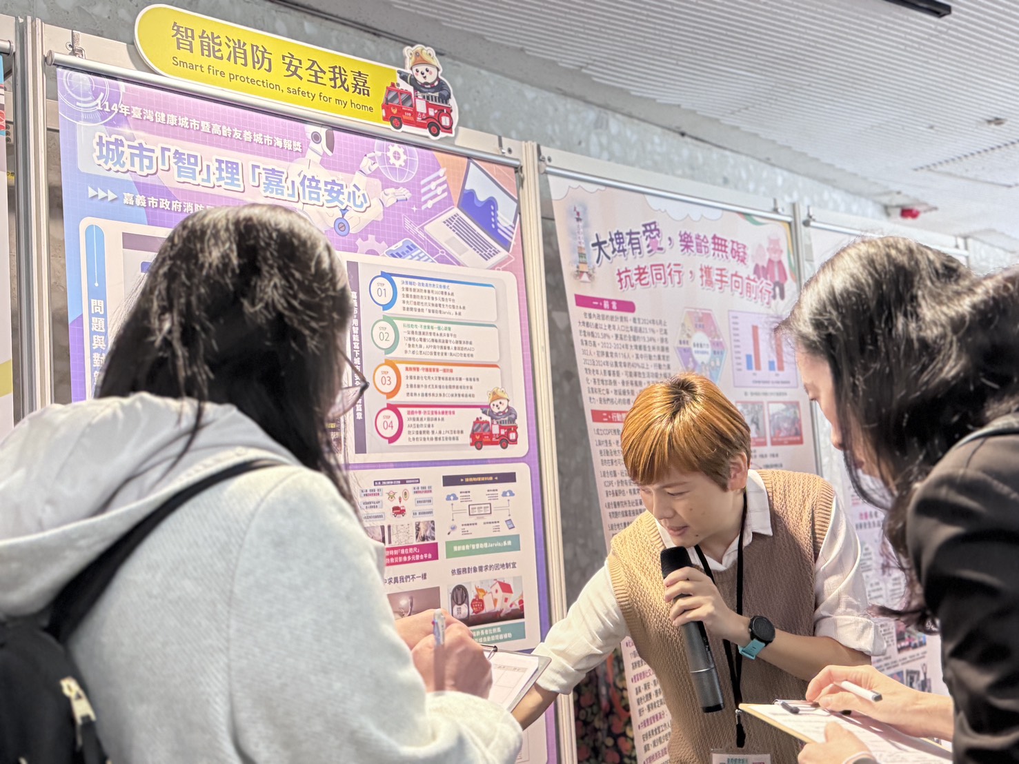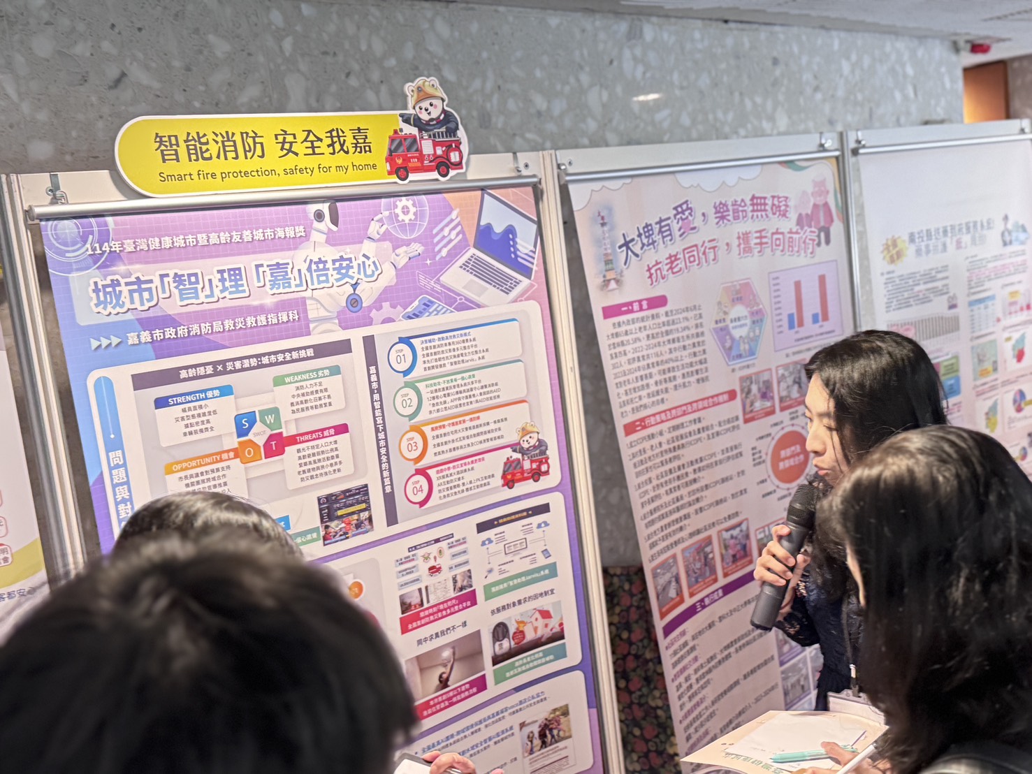 三、消防局「城市『智』理 『嘉』倍安心」榮獲高齡友善城市類海報獎銀獎:首創五樓以下建物普設住警器同中求異、瓦斯爐自動關閉器補助等風險預警,守護居家第一道防線。跨域合作科技助攻,多元整合平台,啟動高效救災新模式。