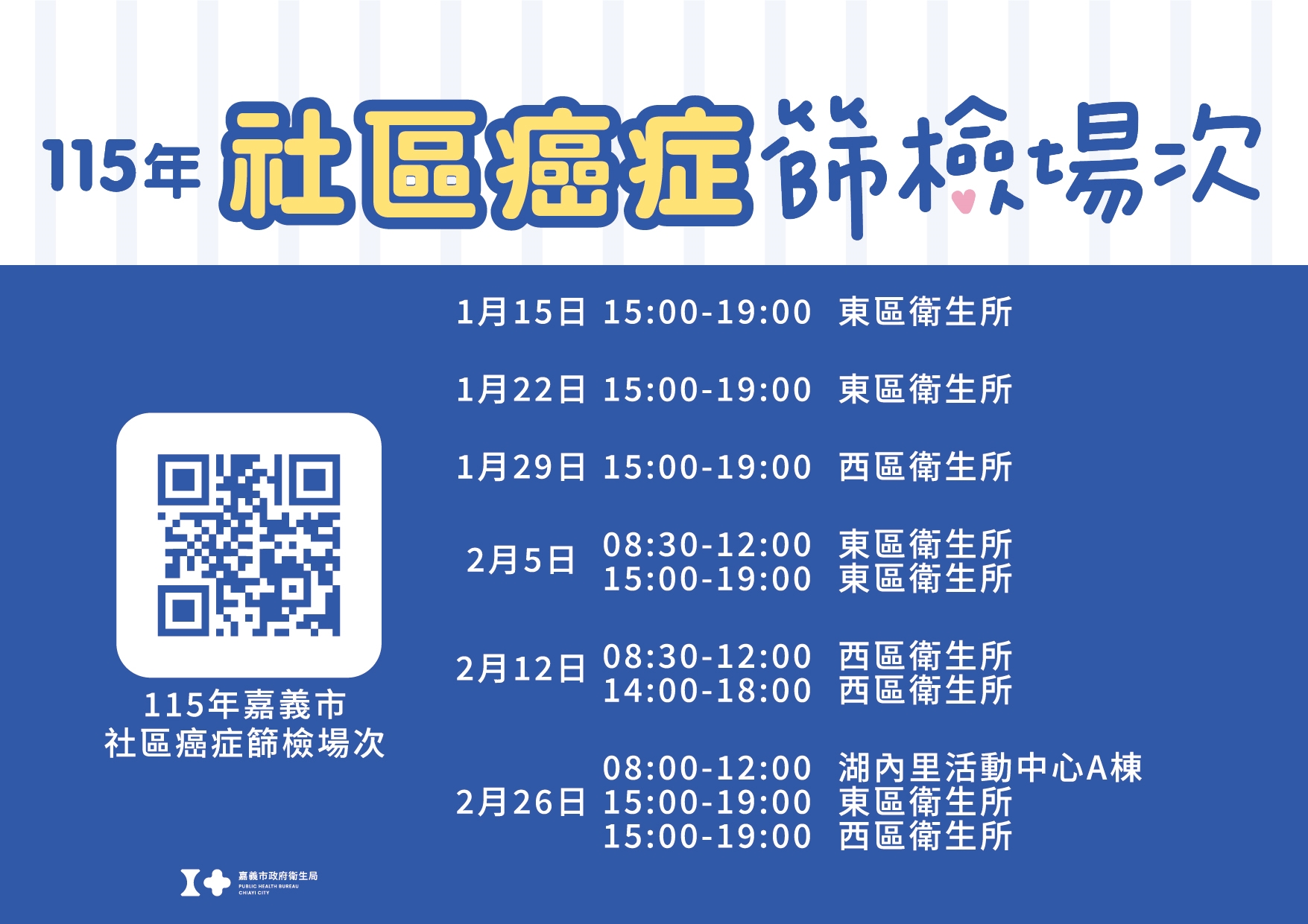 為讓市民篩檢更方便,衛生局同步規劃下班後及假日的社區癌症篩檢場次,攜手合約醫療院所提供貼心服務,讓忙碌生活也能輕鬆完成檢查。呼籲市民把握公費篩檢與抽獎活動時期,現在就行動,為自己篩出健康、抽中好禮!社區篩檢場次與抽獎活動辦法,請至嘉義市政府衛生局官網查詢(https://health.chiayi.gov.tw/cp.aspx?n=12898)。