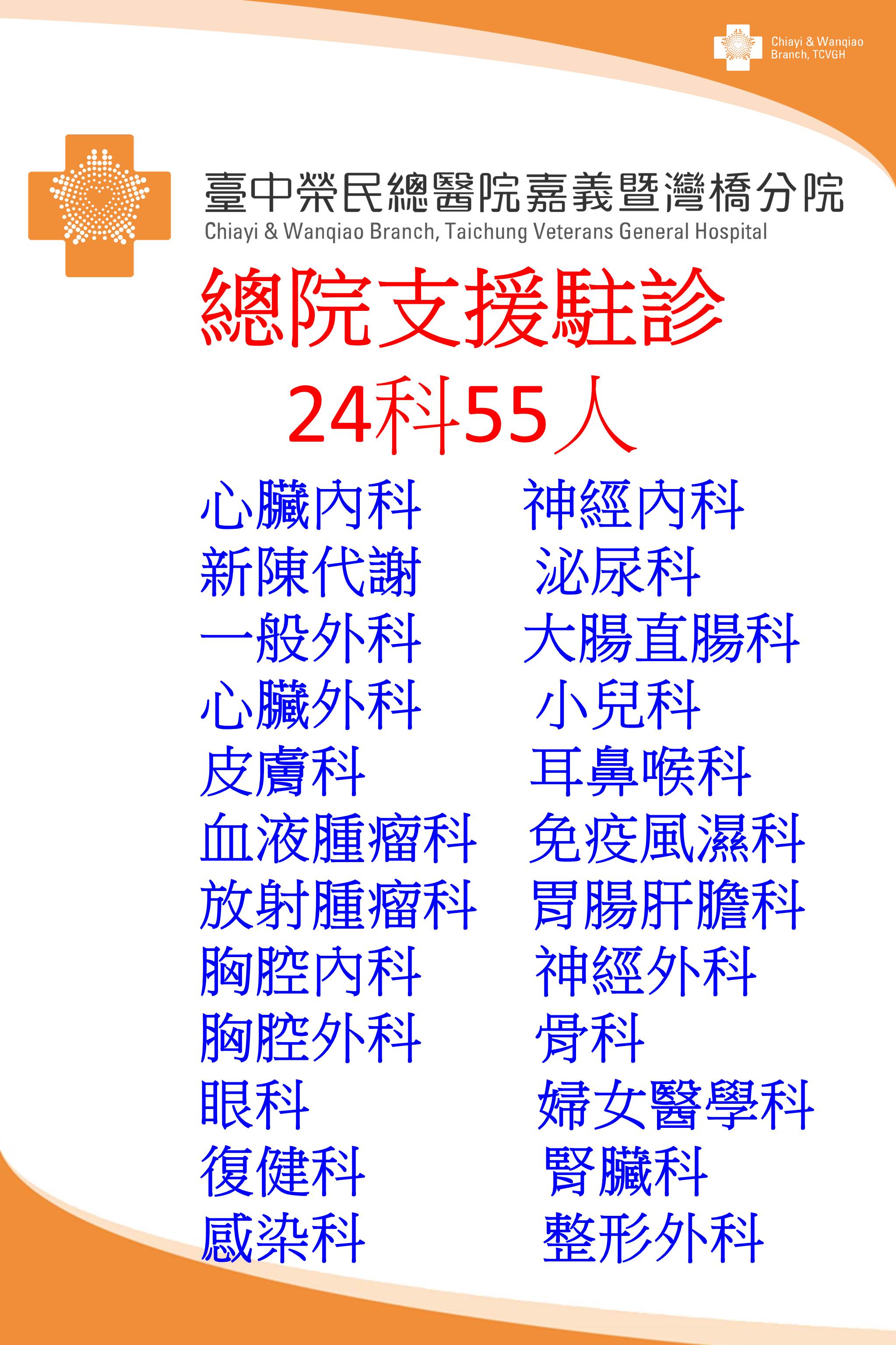 臺中榮總嘉義分院陳正榮院長表示,感謝傅雲慶總院長親自領軍率隊把總院最優、最先進的醫療資源挹注嘉義,包含兒童心臟專科、神經內科、骨科、神經內科、眼科、腎臟、小兒科、大腸直腸科、新陳代謝科、泌尿外科、復健科等高達24科、55位頂尖專科醫師,自115年3月起駐診嘉義市,為嘉義鄉親建構兼具專業深度與在地溫暖的精準醫療體系。