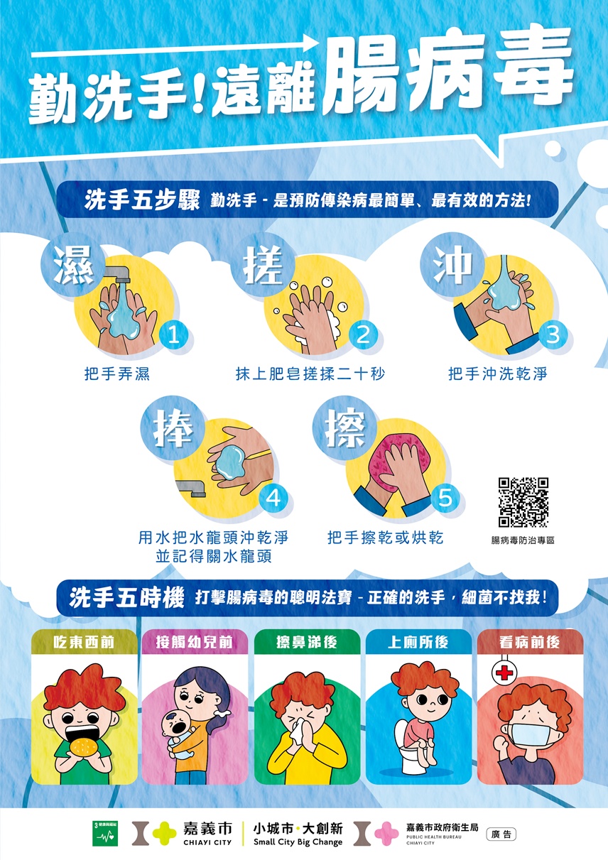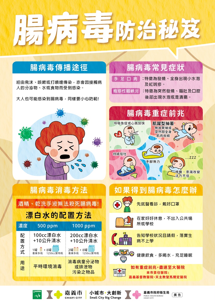 嘉義市衛生局提醒,腸病毒感染大多為輕症,但5歲以下嬰幼兒為腸病毒重症高危險群,如家中嬰幼兒出現嗜睡、意識不清、活力不佳、手腳無力或麻痺、肌抽躍(無故驚嚇或突然間全身肌肉收縮)、持續嘔吐、呼吸急促或心跳加快等重症前兆,請儘速至腸病毒重症責任醫院(嘉義基督教醫院/天主教聖馬爾定醫院)就醫。民眾如有相關問題,可參閱疾管署全球資訊網( http://www.cdc.gov.tw )或至衛生局網站/疾病管制科/傳染病防治/腸病毒防治( https://health.chiayi.gov.tw/cp.aspx?n=6039 )查詢。