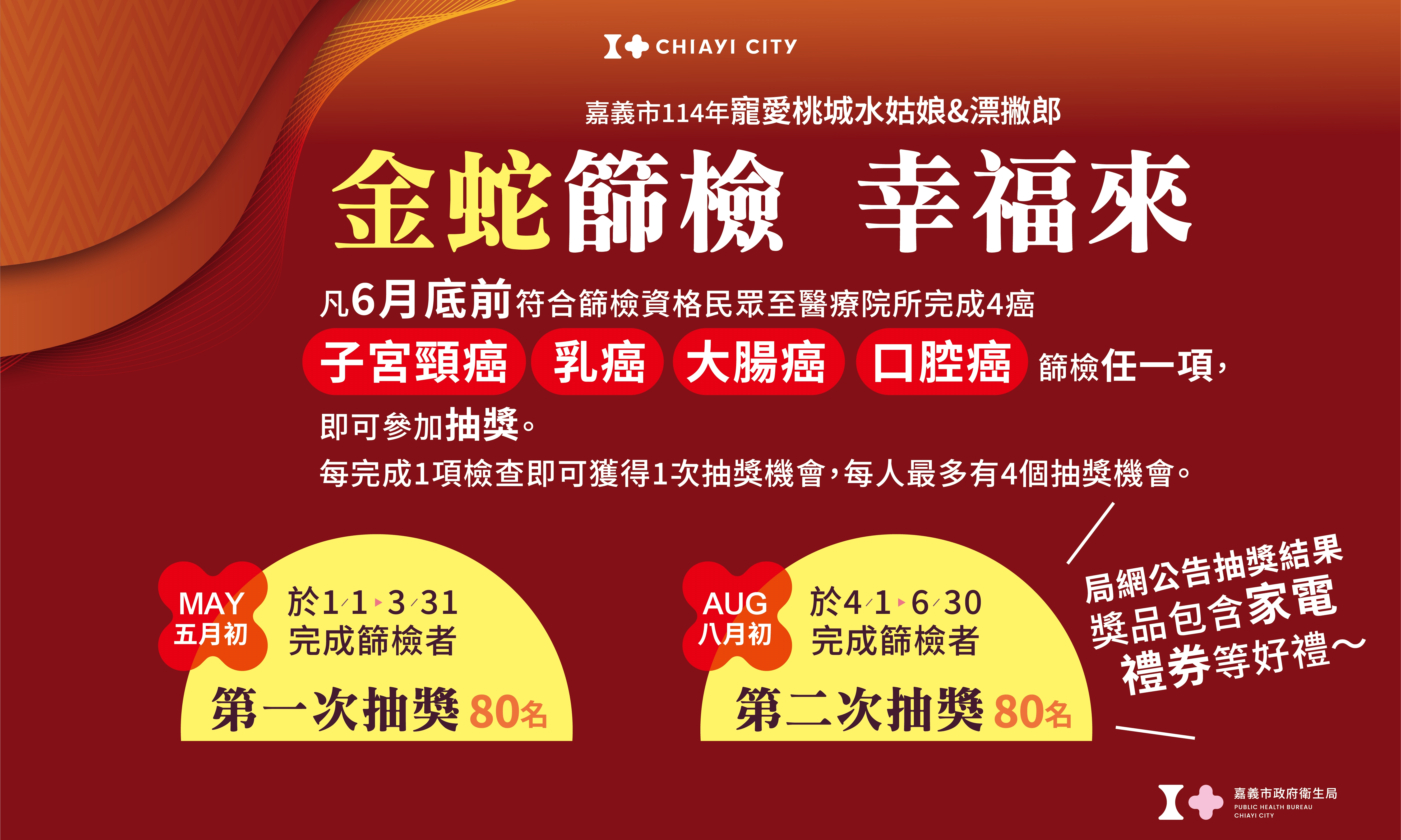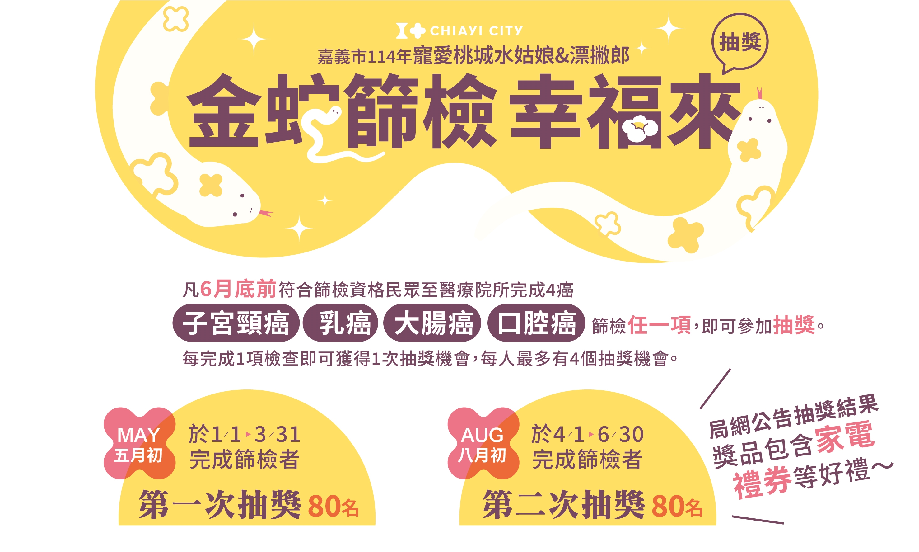 本局辦理【嘉義市114年寵愛桃城水姑娘&漂撇郎 金蛇篩檢幸福來】抽獎活動,以鼓勵市民參與癌症篩檢,早期發現早期治療,守護健康,第二次抽獎於8月5日完成抽獎,得獎名單如附件。