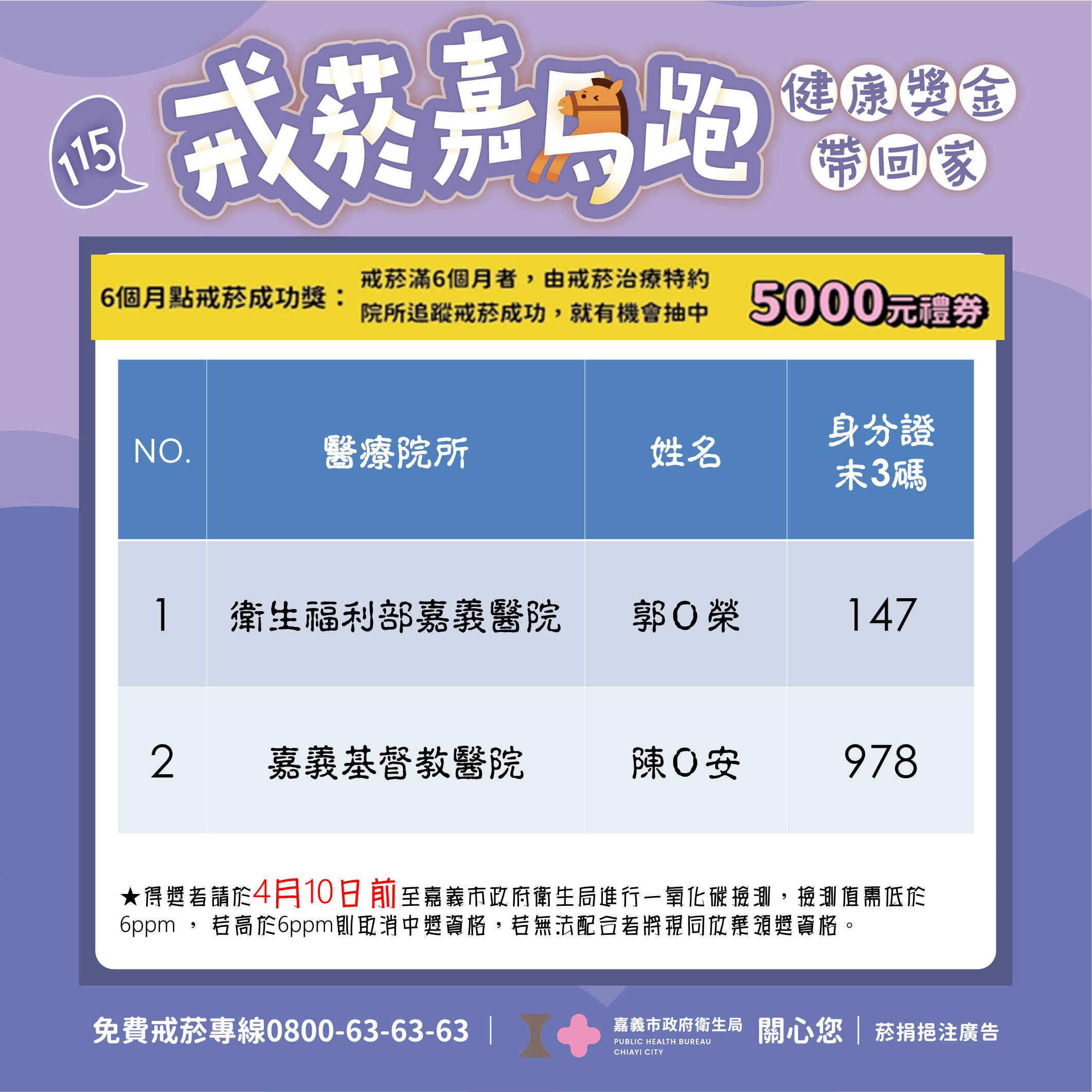 三.3個月戒菸成功獎:王O勝、蔡O榮、馬O炳、翁O宗、謝O仁 等5名2,000元商品提貨劵。