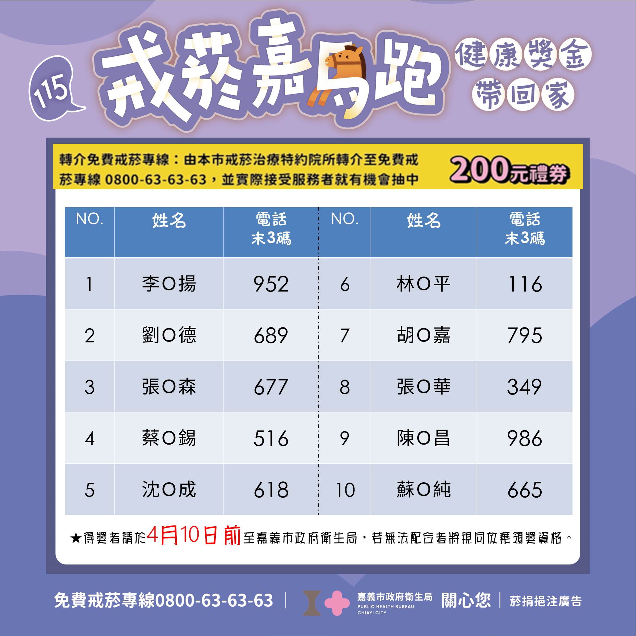為鼓勵吸菸者撥打戒菸專線及使用二代戒菸服務,本局特辦理抽獎活動,實際接受服務、參與二代戒菸及戒菸成功者得獎名單公布(如附件),亦同步公告於衛生局「嘉市A健康」FB粉絲專頁,於115年3月抽出得獎者,分別為: