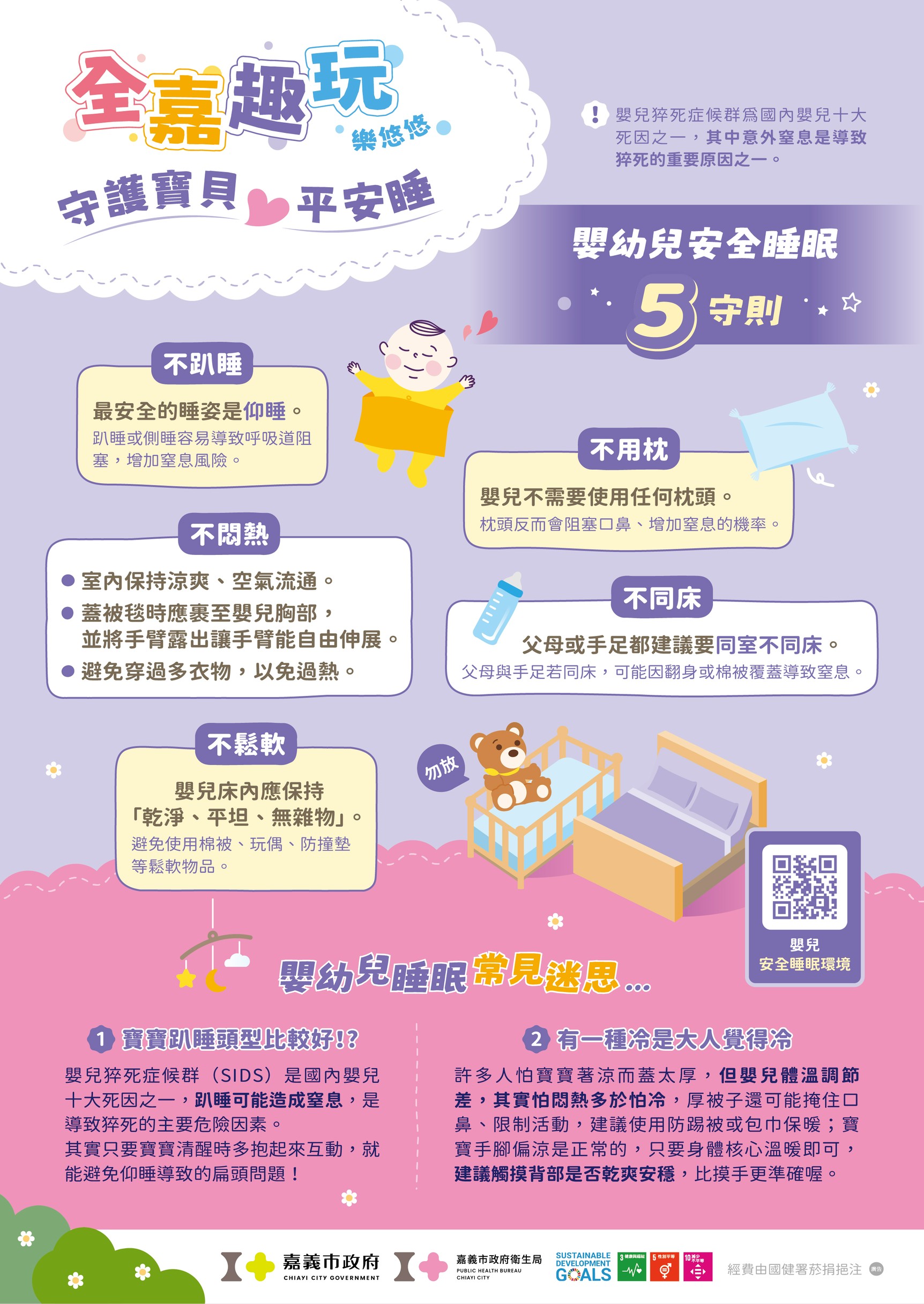 為推廣嬰幼兒睡眠安全觀念,協助旅宿業者於提供嬰兒床服務時同步加強宣導,本局製作嬰幼兒睡眠安全文宣,內含「嬰幼兒安全睡眠五守則」與「嬰幼兒睡眠常見迷思」,方便旅宿業者張貼於館內或提供入住家庭參考。 歡迎各旅宿業者下載使用,共同營造安全、安心的嬰幼兒友善住宿環境。
