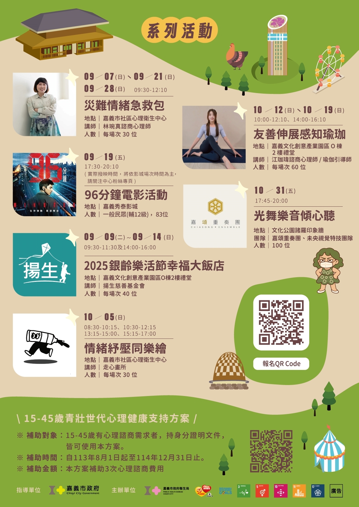 嘉義市政府衛生局提醒,心理健康月系列活動即日起陸續開放報名,名額有限、額滿為止。活動資訊與報名方式,請持續追蹤「嘉義市社區心理衛生中心」官方Facebook、Instagram及LINE帳號,掌握最新動態。